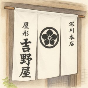 待合所の暖簾が老舗の空気を演出。屋形船の影響もあるのかも知れないが、和な雰囲気が東京深川という地域柄としっくりくる。
